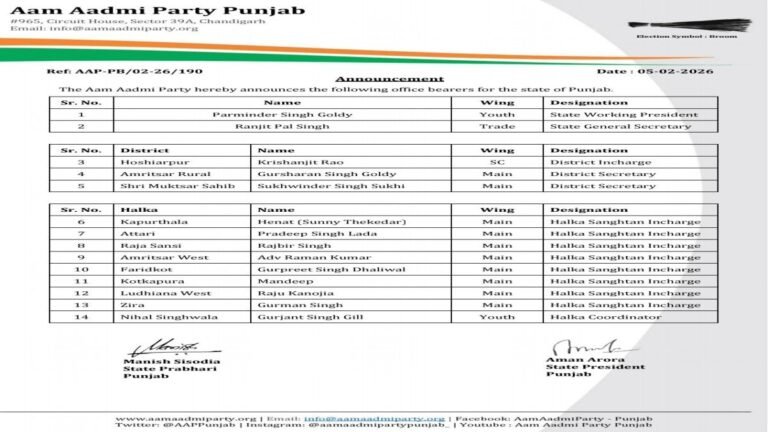 आप पंजाब द्वारा राज्य, ज़िला और क्षेत्र स्तर पर महत्वपूर्ण संगठनात्मक नियुक्तयों की घोषणा Posted on February 5, 2026February 5, 2026 आम आदमी पार्टी (आप) पंजाब ने संगठनात्मक ढांचे को और सशक्त करने के उद्देश्य से विभिन्न विंगों में नए पदाधिकारियों की नियुक्ति…